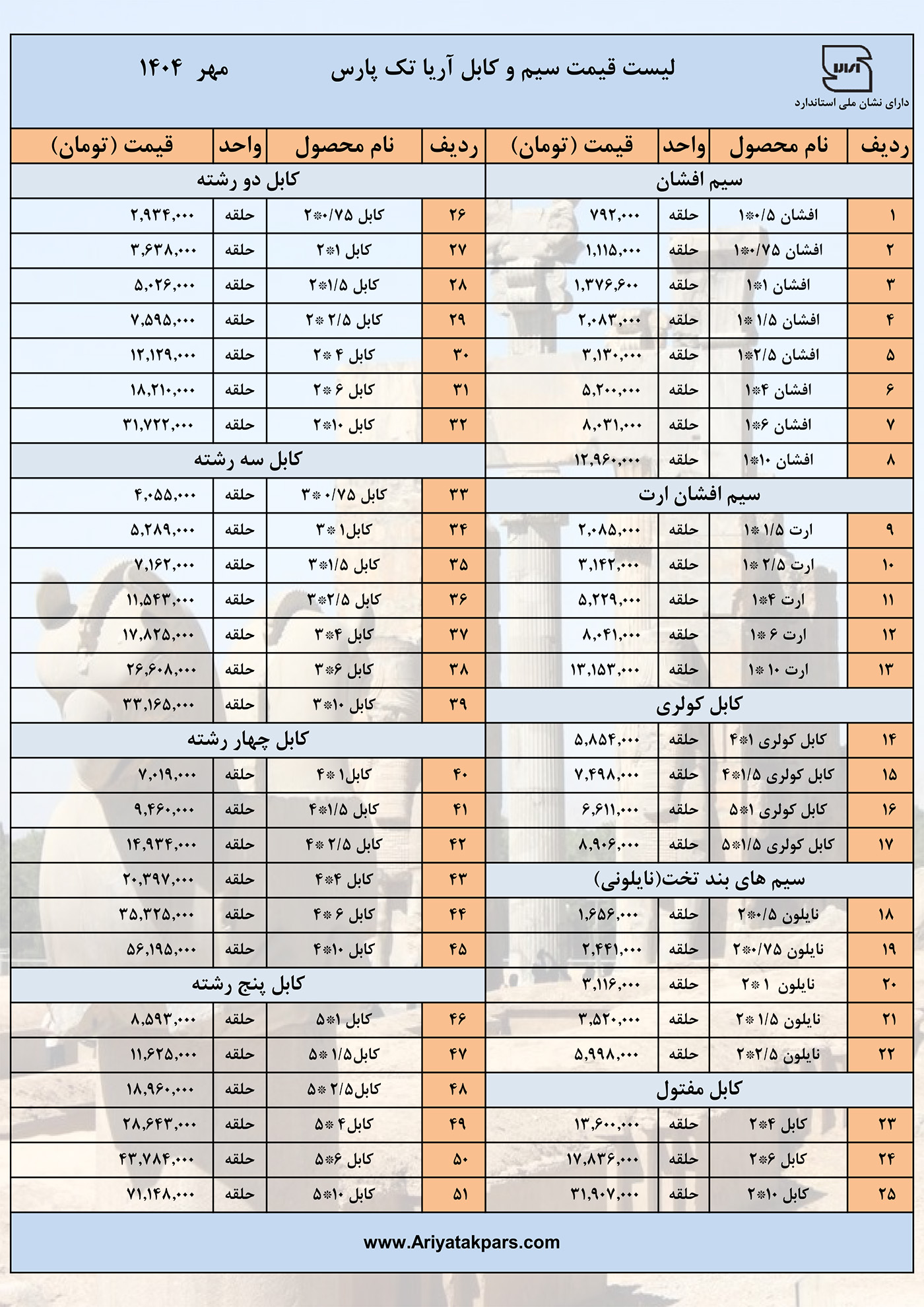 در این صفحه میتوانید لیست بهروز قیمت انواع سیم و کابلهای افشان برق را مشاهده کنید. تمامی محصولات آریا تک پارس با استفاده از مواد اولیه با کیفیت و تکنولوژیهای روز تولید شده و با تضمین کیفیت ارائه میشوند.